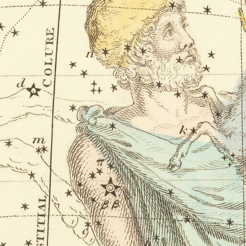 Striking star chart of Auriga, also showing parts of Gemini, Ursa Major, Hercules Telescope, Cassiopeia, Perseus and part of Taurus. Marvelously engraved and delicately colored.
