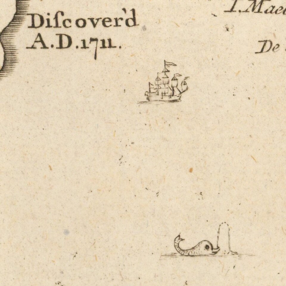 The map shows Houyhnhnms Land to be south of Australia; it indicates Edels Land and Lewins Land to the north, and Nuyts Land to the north-east, on the mainland with the islands of St Francis and St Pieter further east, and Sweers, Maatsuyker and De Wit islands to the east. The map is somewhat careless with the scale, however; Edels Land to Lewins Land are shown adjacent, while in reality they are some 600 miles apart, while the sweep of the Great Australian Bight, from Cape Leeuwin, Australia's south-westerly point to the Maatsuyker Islands, off the southern tip of Tasmania, is nearly 2000 miles.