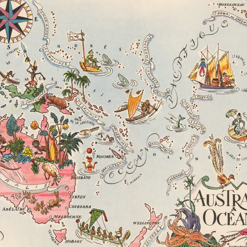 Decorative map of Australia, the Philippines, New Guinea, New Zealand and the South Pacific, published by Jacques Lizou.