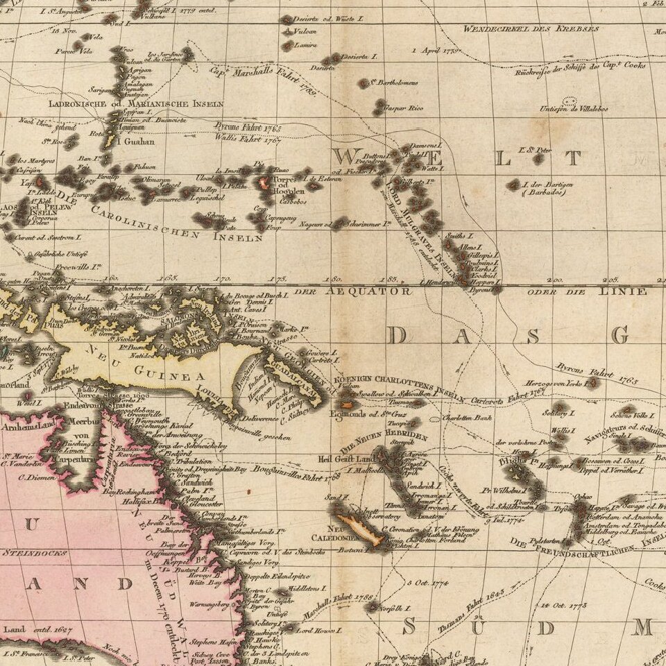 The map reflects the booming German market for all things Pacific in the wake of Cook's voyages. The Germans themselves would start to explore to the region in the nineteenth century and the German Empire would eventually encompass German New Guinea (Papua New Guinea, Solomon Islands, Palau, Federated States of Micronesia, Nauru, Northern Mariana Islands, Marshall Islands, Samoa) from 1884 to 1919.