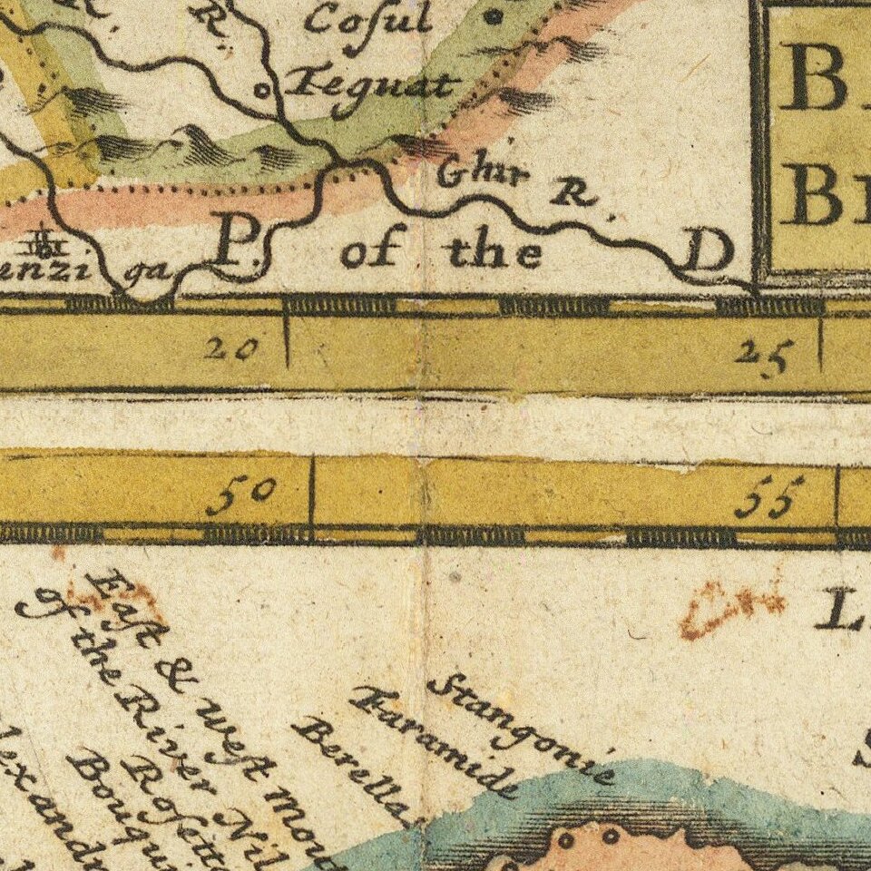 Over the course of his career, he published dozens of geographies, atlases, and histories, not to mention numerous sheet maps. His most famous works are Atlas Geographus, a monthly magazine that ran from 1708 to 1717, and The World Described (1715-54). He also frequently made maps for books, including those of Dampier’s publications and Swift’s Gulliver’s Travels. Moll died in 1732. It is likely that his plates passed to another contemporary, Thomas Bowles, after this death.
