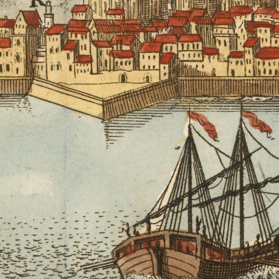 Finely engraved view of Barcelona, published in Augsburg by Johann Stridbeck.