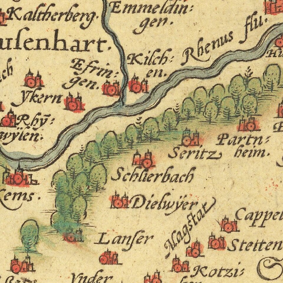 Old color map of the Basel region by Abraham Ortelius, from his Theatrum Orbis Terrarum, the first modern atlas.