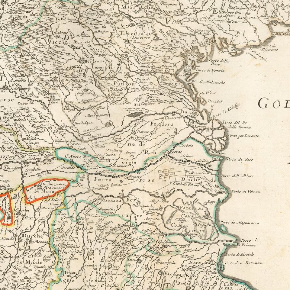 Nicolas Sanson's 1648 double-page engraved map of northeastern Italy, showing Istria and the top of the Gulf of Venice to Genoa and the Lake Regions, centered on the Po River and Venice.