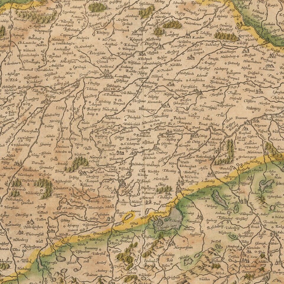 The map map shows the course of the Danube in the north, flowing through Ingolstadt, Strassburg, and Passau and extending to the Alpine cities of Fussen, Partenkirchen, Innsburck and Saltzberg in Austria.