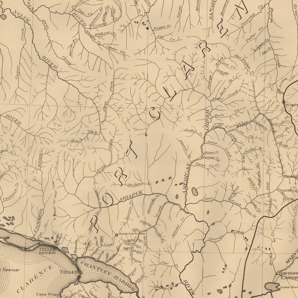 Detailed map of the Teller-Kougarok area of the Seward Peninsula, the westernmost point of the mainland of Alaska, just across the Bering Straits from Russia.