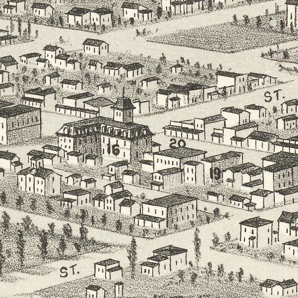 Published in 1877, Glover's view of Santa Barbara is the earliest large-scale printed view of the city, pre-dated only by a much smaller view (16 x 9 inches) by A.E. Mathews in 1873.