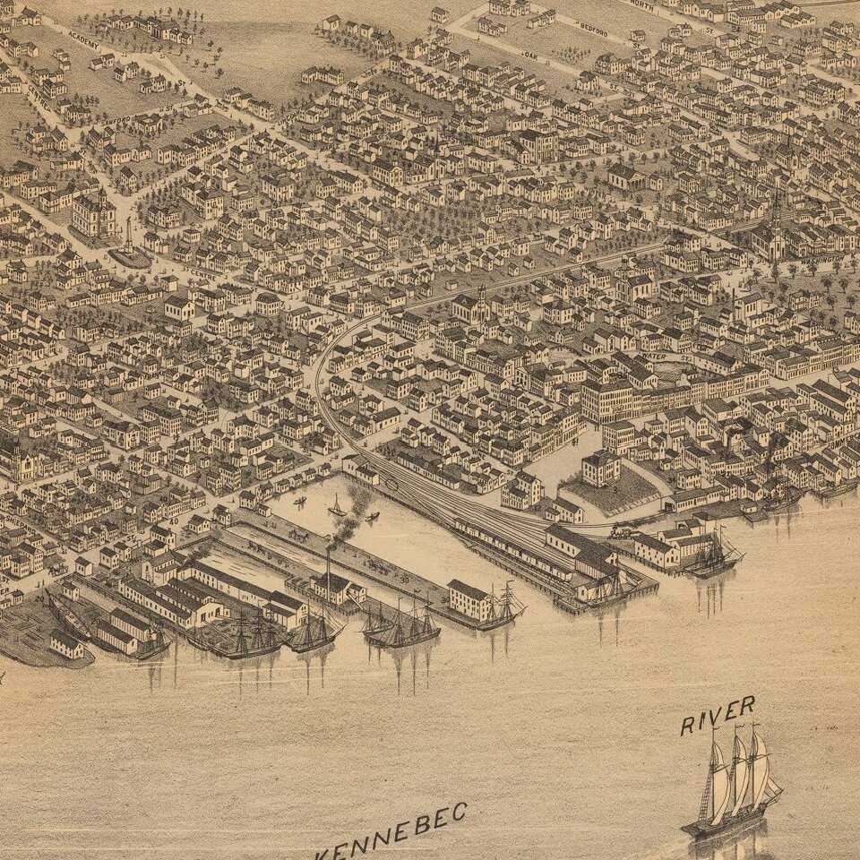 Rare Birdseye View of Bath, Maine, engraved by J.J. Stoner and lithographed by The Shober & Carqueville Litho. Co., in Chicago in 1878.