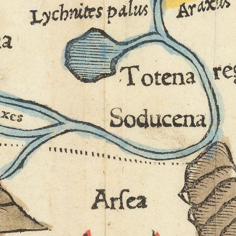 Munster's map shows Noahs Arc in the Caspian Sea, believed to have come to rest in a mountain in Armenia according to the map. Shows Armenia Maior, Iberia, Albania, Colchis, Porte Albanie, the Euphratis River, the Tigris, Assyriae, and many other place names in the cradle of civilization. The map is unchanged from the 1540 edition.