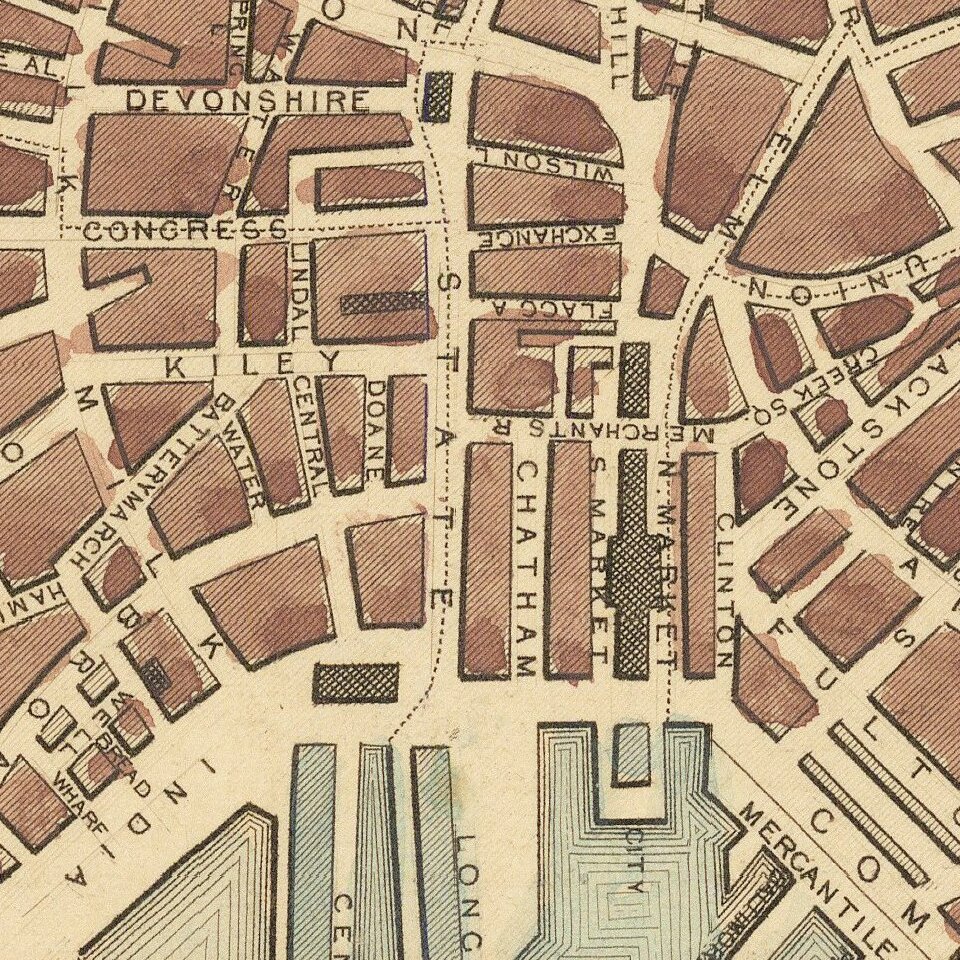 Striking full color example of Tallis's town plan of Boston, with a massive view and vignettes of Bunker Hill Monument and the State House.