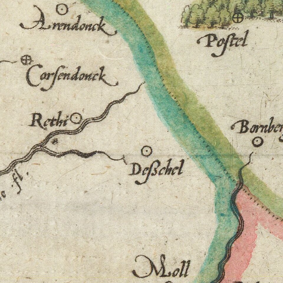 Tramezini commissioned Jacob Bos ( fl.1549-80), a Dutchman who had become one of the leading fine art engravers in late Renaissance Italy, to produce a new edition of Van Deventer's map of Brabant. The resulting map was first issued in 1556, with a second Tramezini state appearing in 1558. The map remained by far the most accurate and widely-admired survey of Brabant, and the plate was acquired by Giovanni Orlandi, who published the present issue of the map in Rome in 1602.