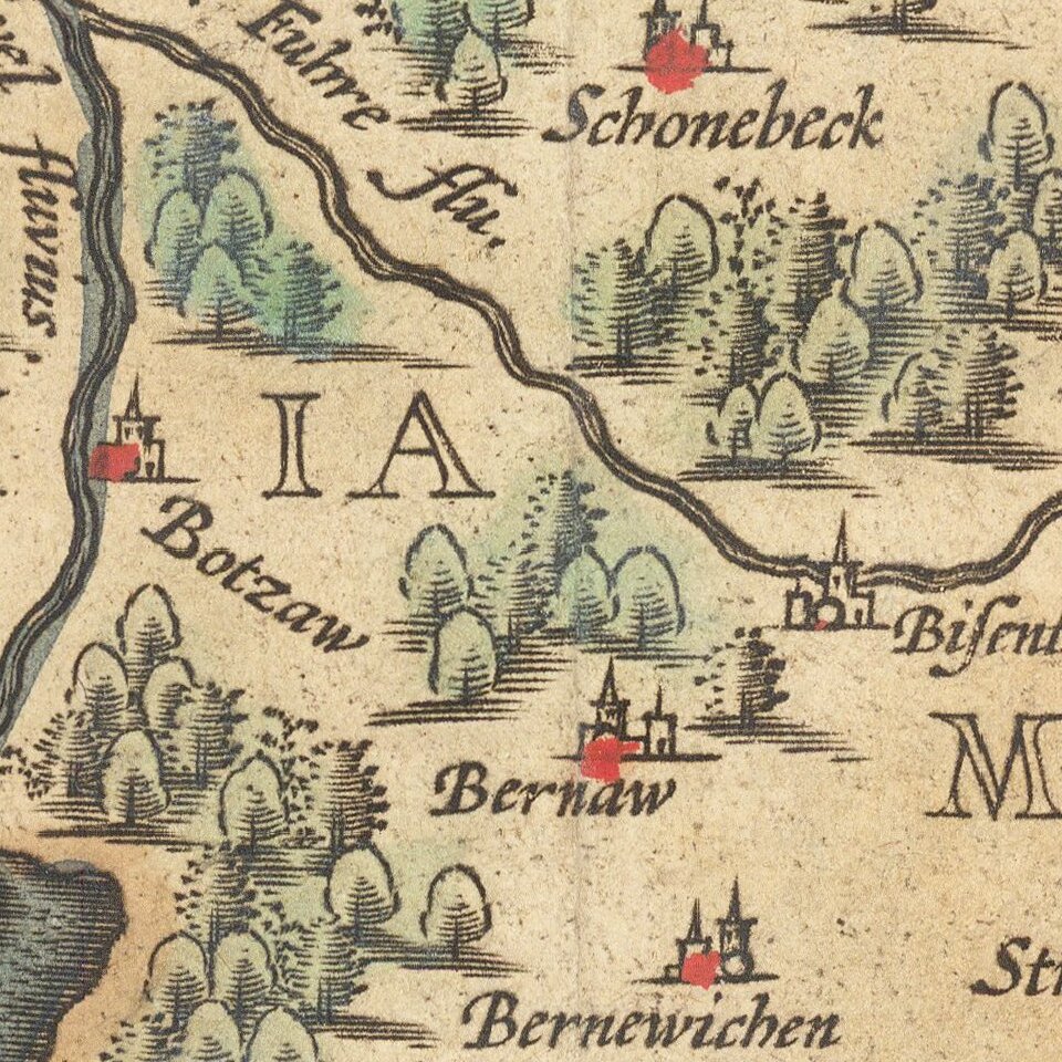Fine old color example of Abraham Ortelius' map of the Brandenburg and Berlin regions.