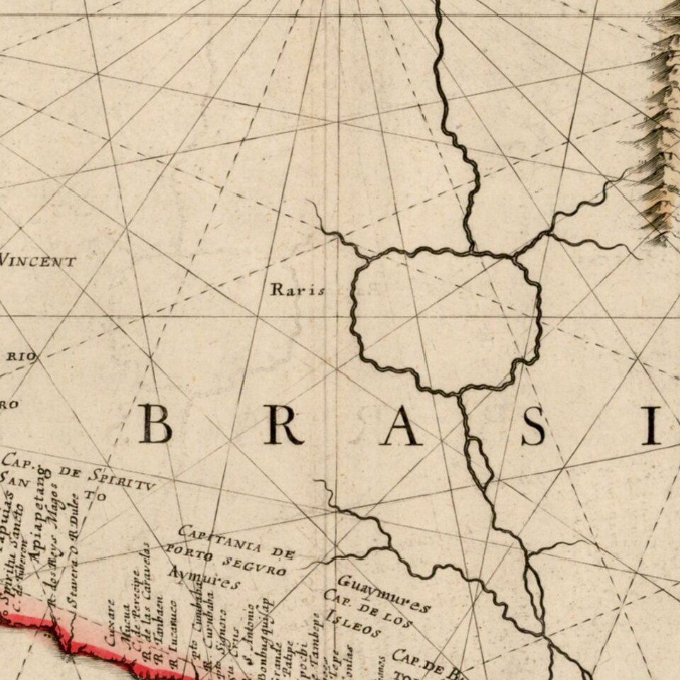 Decorative example of Blaeu's second map of Brazil, oriented with west at the top.