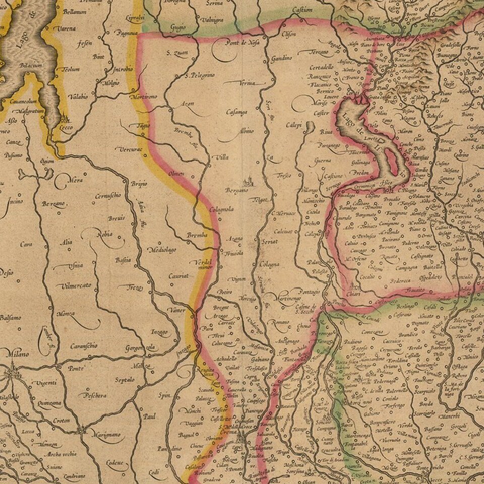 Striking map of Brescia, centered on Bergamo and including Milan, Cremona, Brescia, Lago De Garda, Lago Di Como, etc.