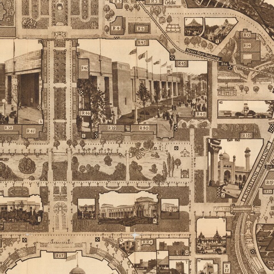 A highly decorative and detailed map of the 1926 British Empire Exhibition, incorporating many photographs of buildings both in the border, and integrated into the map image.