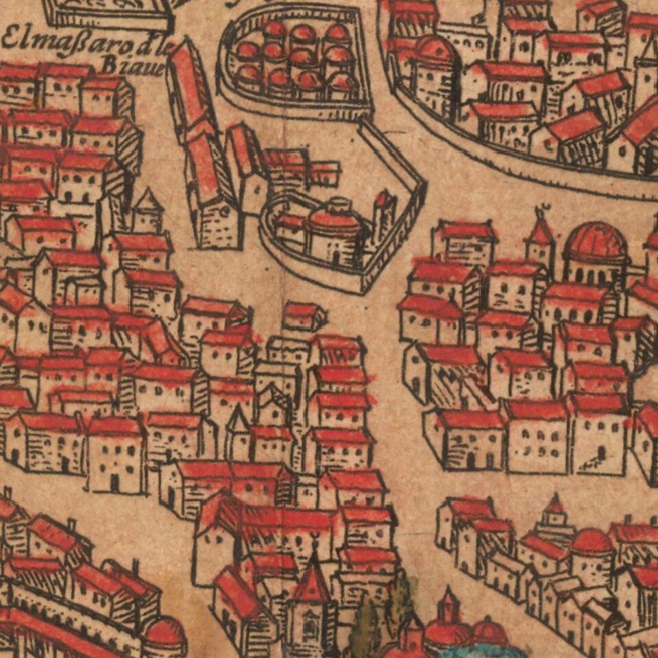 The original of this map is often incorrectly attributed to Giovanni Andrea Vavassore, called Vadagnino, who created a fine view of Constantinople published in Venice in 1520. Vavassore's view is also said to have influenced the view published in the 1550 and subsequent editions of Sebastian Munster's Cosmographia. Vavassore's view is in turn said to have been based on a 1480 view, now apparently lost, by Venetian artist Giovianni Bellini, who was invited by Mehmet II Fatih, i.e. 'the Conqueror' to Constantinople. But a closer comparison of the Vavassore, Munster, and Braun & Hogenberg maps or views of Constantinople reveals significant differences. Most notably in the topographic details of the city-scape, especially the Roman remains such as the Hippodrome, today's 'At Meydan', which while not absent in the Vavassore map, is not clearly depicted, whereas it is very clear, detailed and accurate in both the Munster and Braun & Hogenberg maps, as are the locations of churches, palaces and other monuments which are more accurately depicted in the Munster and Braun & Hogenberg maps. Compared with the Munster map, the Braun and Hogenberg map or view of Constantinople is in particular distinguished and made unique by the portrait of the mounted horseman identified as the Ottoman ruler Suleiman the Magnificent (6 November 1494 - 7 September 1566) who claimed among other titles to be Roman Emperor, a title which even the Holy Roman Emperor Charles V was forced to recognize in 1547. In his essay Stargardt puts forth evidence that "the title of the map 'Byzantium Nunc Constantinopolis' may be a part of Habsuburg anti-Ottoman propaganda. He notes that the origins of the name Byzantium can be found in mythology Byzas decided to set sail with his companions to found a colony but before departing he consulted the Oracle at Delphi who gave him the enigmatic advice "Found your colony opposite the land of the blind". He set sail for the Black Sea intending to join the burgeoning Greek colonies there. But, as he came to the Sea of Marmara entrance to the Bosphorus, he glanced at the flourishing settlement of Chalcedon, today's Kadikoy, on the Asian shore and then across to the European shore where he was struck by the magnificent but uninhabited (by humans at any rate) triangular peninsular pointing at Asia with its family links to his mother and grandmother. To Byzas it seemed clear the settlers of Chalcedon were blind for ignoring the magnificent European location and Byzas decided to found his colony on that spot. Whatever the truth of these charming legends, the city and state of Byzantium grew from its mythical 6th century BC roots into a rich and flourishing trading state that by at least the 1st century BC had taken the star and crescent moon as its emblem. It remained independent until 196 AD, when it was conquered by Roman forces loyal to Septimus Severus, after having allied itself with the losing side in one of Rome's frequent civil wars. The city suffered in the siege that led to its capture but Severus caused it to be re-built and it continued as an important Roman city. Its highly defensible and strategic location astride maritime and land trade routes from East to West and North to South attracted Constantine the Great and he chose it to replace Rome as the Imperial capital. Re-dedicated as Constantinople on 11 May 330 AD, a name it was to keep for the next 1,600 years, the new capital of the Roman Empire was self-consciously a Christian city, as opposed to pagan Rome which continued to host pagan traditions in its city government until the late 4th century AD. Constantinople's two principal churches, Hagia Irene and Hagia Sophia, both illustrated on this map and both still standing today, are dedicated to 'Sacred Peace' and 'Sacred Wisdom', reflecting the aspirations of the new imperial capital and the new official Christian religion of the Roman Empire. Constantine the Great encouraged leading Roman families to resettle in Constantinople, and the transfer of wealth and power to Constantinople was reflected in the ascendancy of the city as the new imperial capital over Rome. An ascendancy reinforced when Rome was sacked by invading "barbarians" while Constantinople was not. Though Constantinople was firmly located within the Greek speaking sphere of the Roman Empire, the Court and administrative language continued to be Latin until in or about 620 AD when, according to the later Emperor Constantine VII Porphyrogennetos, the Emperor Heraclius decreed that Greek would replace Latin as the official language for military and administrative purposes. To suggest to a Latin speaking Roman Emperor like Justinian that either the city he ruled from or his empire was "Byzantine" would, one imagines, not have been greeted favorably. The city of Rome was a hollow shadow of its former glory and glad to accept protection from Justinian and his successors. For the Romans who ruled from Constantinople until Tuesday 29 May 1453, the city was Constantinople and their realm was Roman and that is how their contemporaries, friends or foes, around the world referred to them. Until the late 16th century the names "Rome", "Roman" and "Roman Empire" were the accepted names for the Roman Republic, the Roman Empire and what today is generally called the 'Byzantine Empire'. The division of the Roman Empire and the Byzantine Empire is an anachronism with its roots in 16th Century Habsburg anti-Ottoman propaganda. Prior to 1557, "Rome", "Roman Republic" and "Roman Empire" were the accepted names for the geo-political entity that had its mythical origins with Romulus and Remus on or about 21 April 735 BC, with the founding of the city of Rome in Latium, today's Lazio in Italy. Such was the majesty and longevity of the Roman Empire that its name continued to be used to invoke legitimacy long after the Roman Empire's effective demise as a geo-political entity. In the 15th and 16th Century, and to a lesser extent later, th