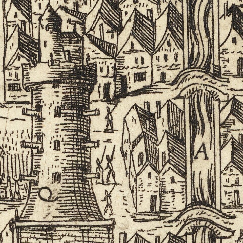 First state of Lafreri's map of Calais, but without mounted legend and note at bottom as mentioned by Bifolco/Ronca. The houses outside the town at top of image depicted burning; with engraved letters "A-P" for a key (see next lot).