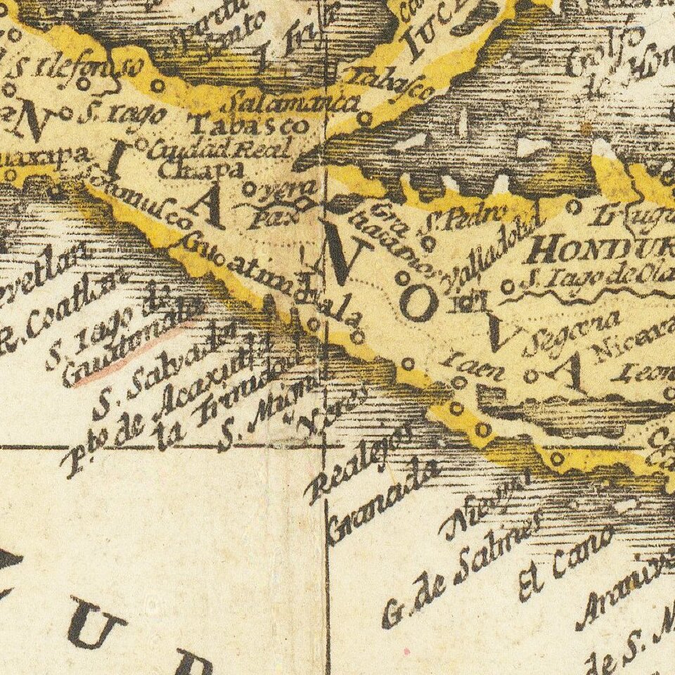 The Straits of Anian are shown forming a Northwest Passage between California and the mythical Terra Esonis, which forms a nearly continuous land bridge from the Northwest to Asia. The Pays de Moozemleck is shown east of the Straits of Anian. This landmark remains virtually unchanged through all of Homann's maps of America, despite the transition to a peninsular California, resulting in an odd change from a coastal to an apparently landlocked position for this landmark.