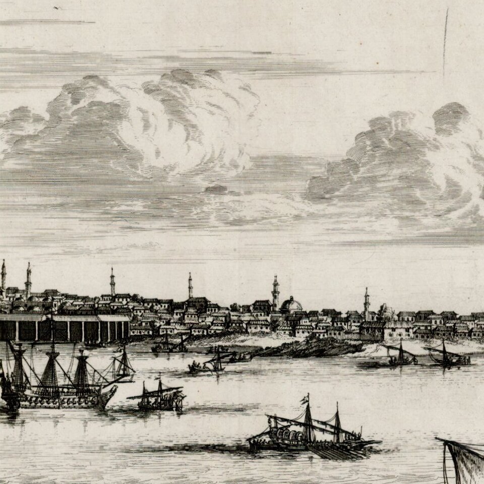 A fine view from the harbor, with sailing vessels in the foreground and a profile of buildings and Minarets on the horizon.