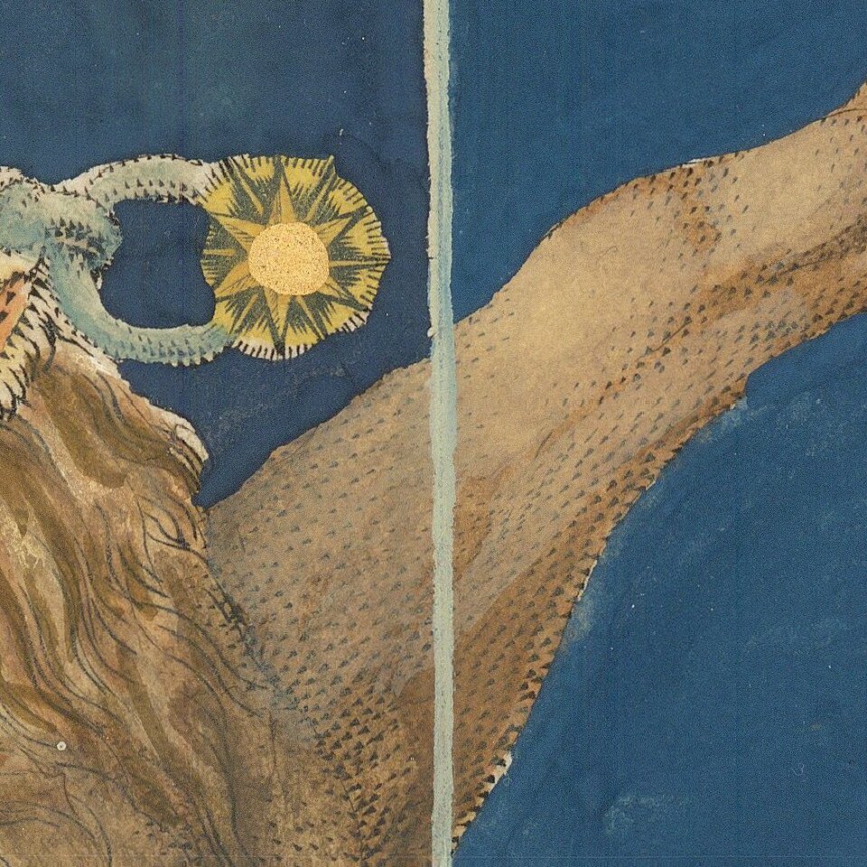 Striking full color example of Bayer's celestial chart of the constellation Canis Major, with the stars heightened in gold. The present example has no text on the verso.