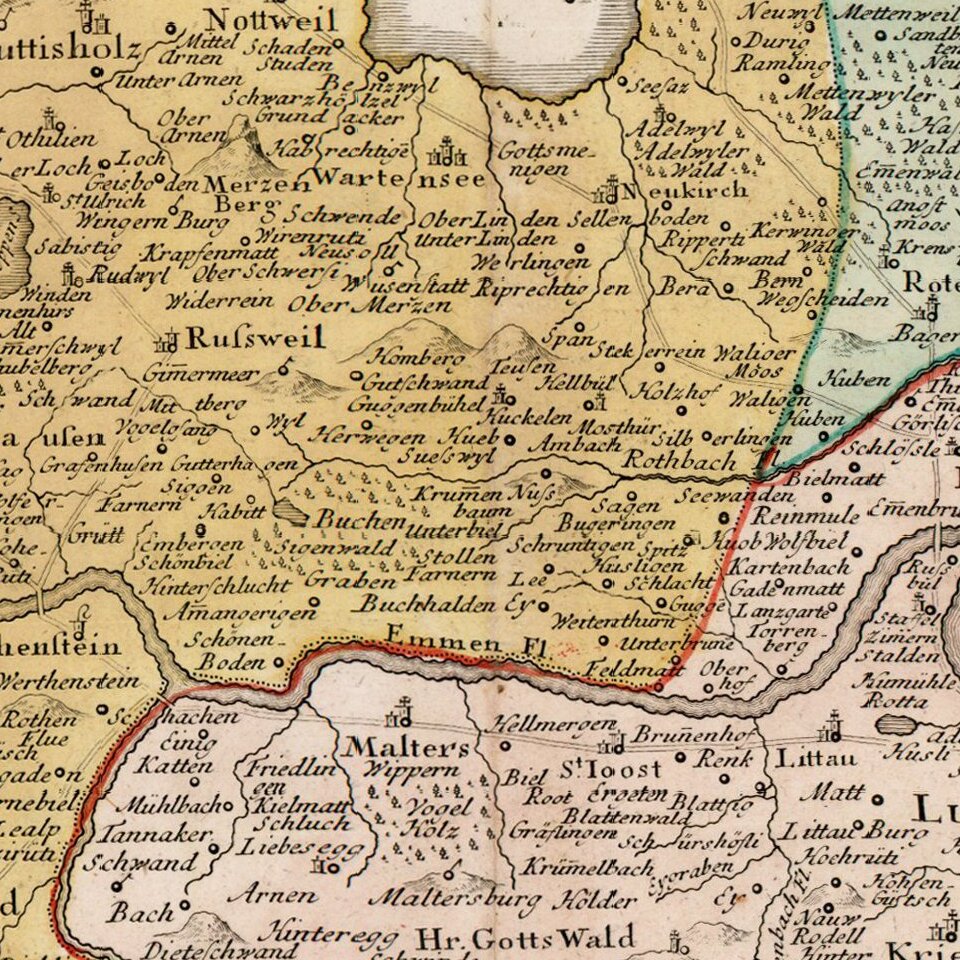 Detailed map of the Kanton of Luzerne in Switzerland with decorative cartouche.