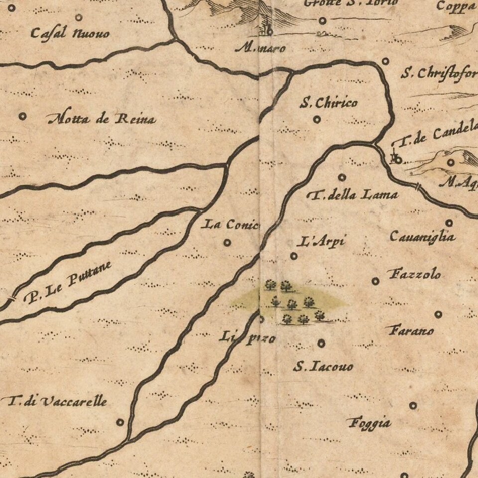 A nice example of Jan Janssonius's circa 1640 double-page engraved map of Foggia, Italy.