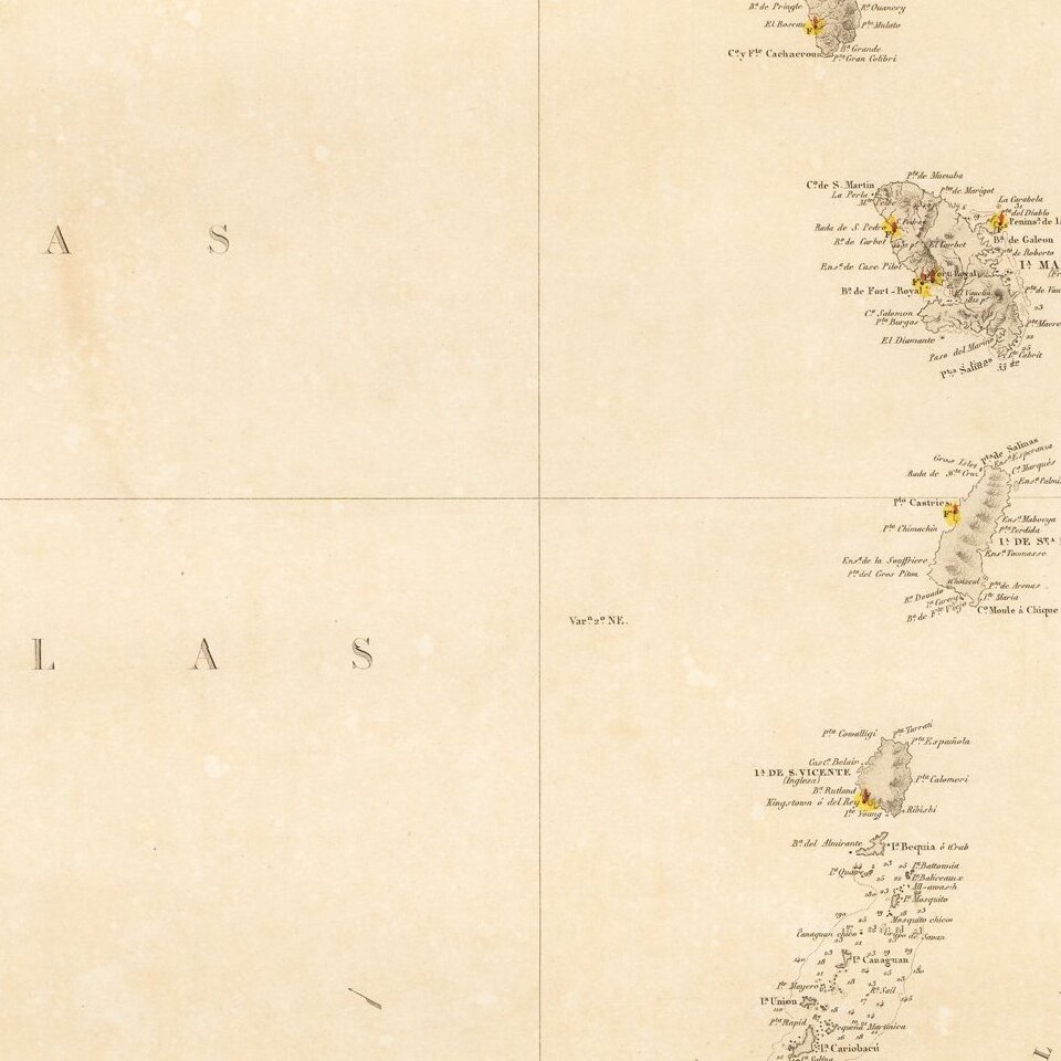 Scarce sea chart of the eastern Caribbean Ocean and the contiguous coastline of South America, published by the Spanish Hydrographical Office, la Direcci ón de Hidrograf ía. Originally issued in 1865, this is a rarer, updated version of 1868. Spanish sea charts of this region in the mid-nineteenth century are quite scarce on the market.