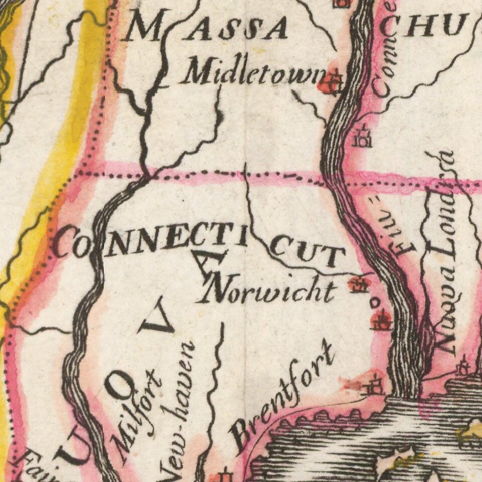 The map covers the region from the Delaware River and New Jersey in the south to Maine and west to the Susquehanna River. The map shows towns, roads, villages, churches, meeting houses, rivers, mountains, inlets, islands and a host of other details.