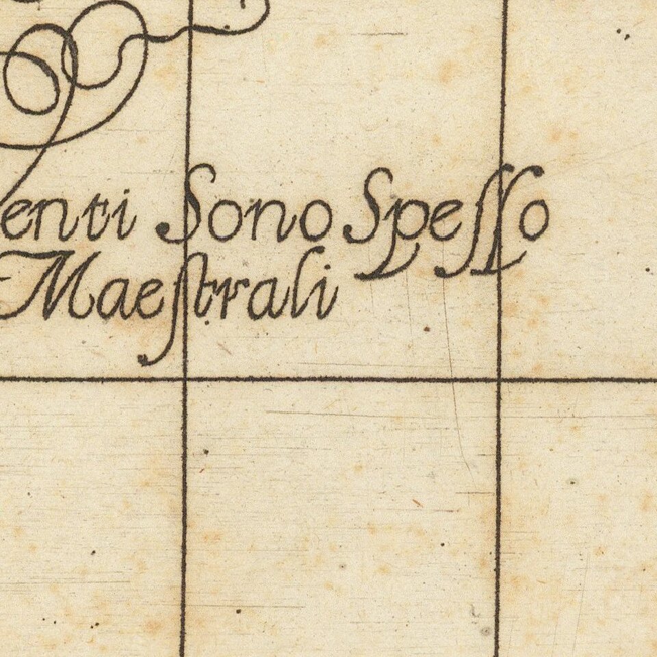 The chart was compiled and drawn by Dudley, but it was engraved by Anton Francesco Lucini (1610-ca.1661). Lucini, a Florentine, did the engravings for Dudley's entire Arcano del Mare, which remain his most famous works. The fine scrollwork and distinctive style of Dudley's charts are due to Lucini, who spent 12 years and 5,000 pounds of copper in making the 200 plates and 146 charts.