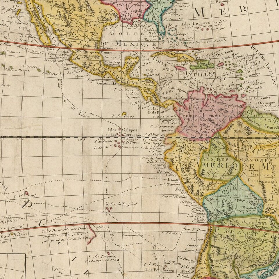 The highly decorative title cartouche is also a throwback, featuring America riding a particularly fierce alligator and gazing upon a cornucopia.