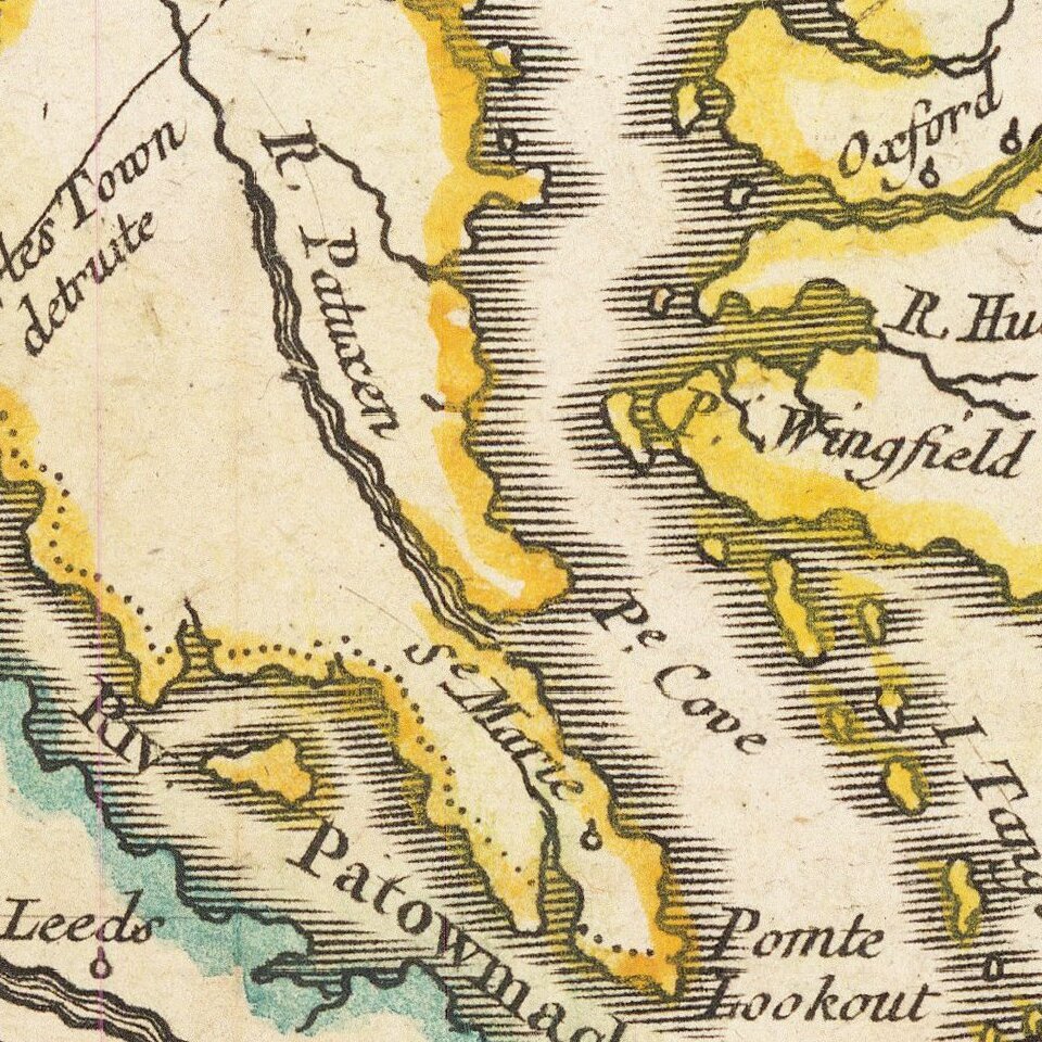 Extends west to the Applachians and shows towns, roads, mountains, rivers, islands, capes, ports and other nice details.