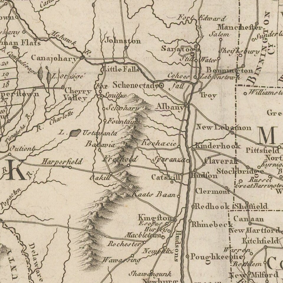 Among the most noteworthy features of the map is its meticulous detail in the area between the Mohawk River and Susquehannah River in New York, detailing the township names given in the Military Tract of Central New York, also called the New Military Tract, which consisted of nearly two million acres of bounty land set aside to compensate New York's soldiers after their participation in the Revolutionary War.