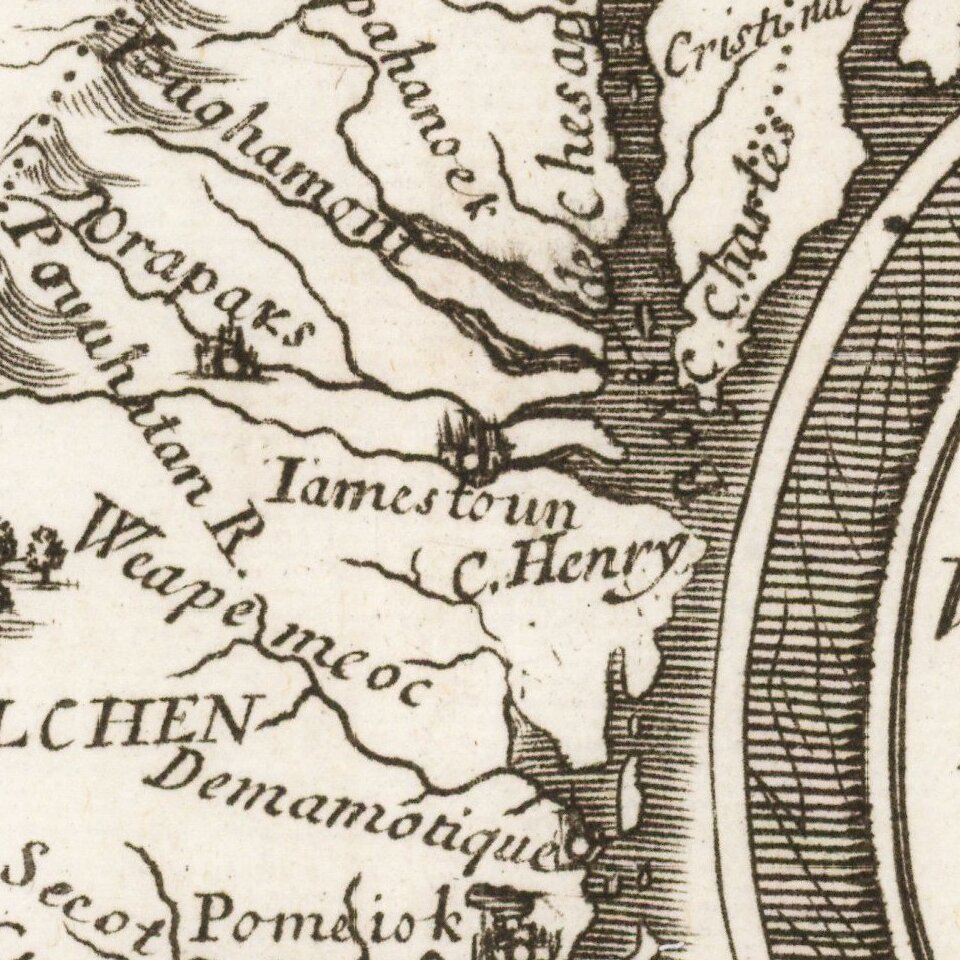 Includes an early depiction of the Chesapeake region, the mythical Lake May above Floride, Jamestown, Cape Henry, Secot, Pomeiok, an early reference to Manhattan and New Amsterdam and an inset of Bermuda.