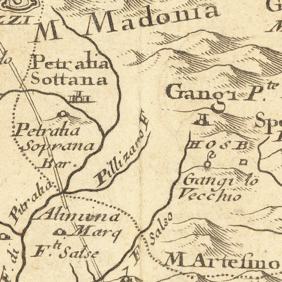 The map extends to include the Aeolian Islands, which are here called the Lipari Islands. It is filled with a wealth of interesting detail including roads, forests, fortresses, churches, abbeys, ancient ruins, aqueducts, and towns.