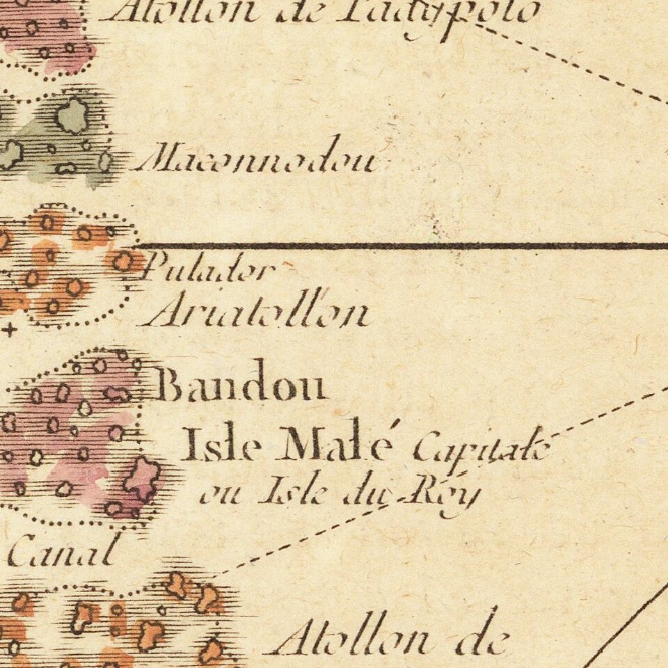 Detailed map of the Maldives, with rhumblines and a large compass rose. Includes a decorative title cartouche.