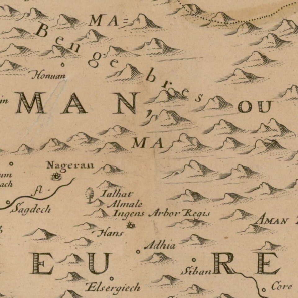The Three Arabias on this map refer to regions named during the Hellenistic period, popularized by Ptolemy: Arabia Petrae (Petree), Arabia Deserta (Desertee), and Arabia Felix (Heureuse). Arabia Petrae (Stony Arabia), Rome’s province, was named for its capital, Petra. Arabia Deserta signifies the desert interior of the peninsula, and Arabia Felix (Fortunate Arabia) was named for its relative greenery and fortunate agricultural climate. The bounds of these three regions often differ between mapmakers and across time, although the names stay consistent.