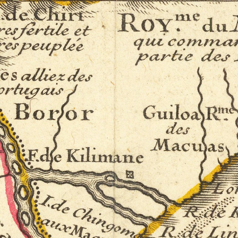 Unlike on the southern part of the continent map, this map contains a large mountain range stretching from southwest to northeast. The note running along the range says, “Mountains of Lupata, called the ‘Backbone of the World’ by the Cafres [local people]”. This feature, and many of De L’Isle’s other details of African cartography, were repeated on later maps throughout the eighteenth century.
