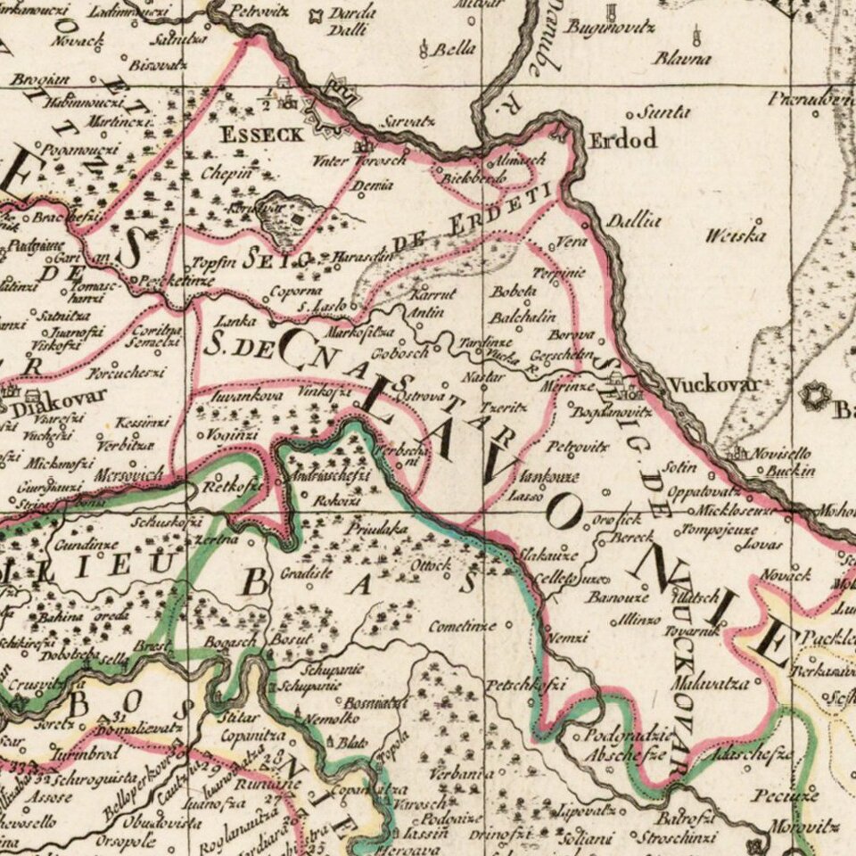 The map is dissected by the Danube River and shows the region south and west of the Danube, extending south to Bosnia and part of Serbia but with greatest focus on the region north on the Kingdom of Slovenia and the Duchy of Syrmia.