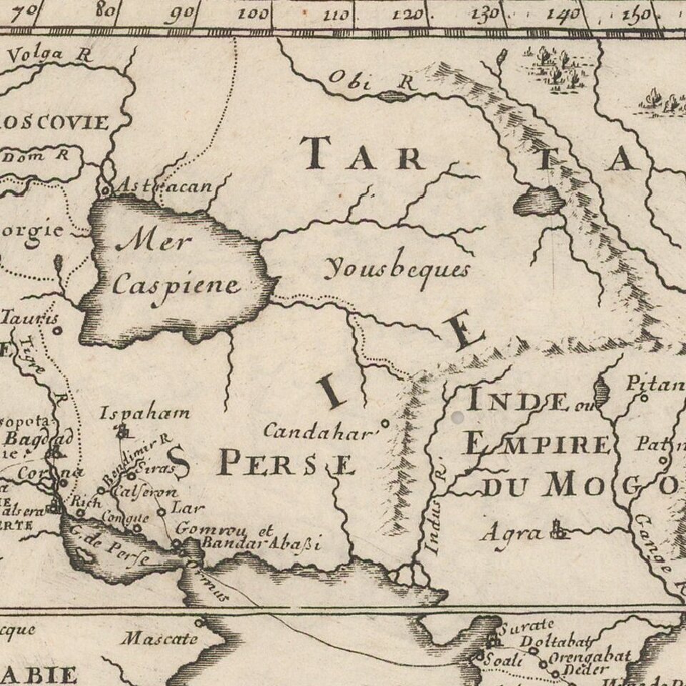 Pierre Duval (1618-1683) was a French geographer, cartographer, and publisher who worked in Abbeville and Paris during the seventeenth century. He was born in the former city, in northeast France, before moving to Paris. Duval was the nephew of the famous cartographer Nicolas Sanson, from whom he learned the mapmaker's art and skills. Both men worked at the royal court, having followed the royal request for artists to relocate to Paris. In addition to numerous maps and atlases, Du Val's opus also includes geography texts. He held the title of geographe ordinaire du roi from 1650 and died in 1683, when his wife and daughters took over his business.