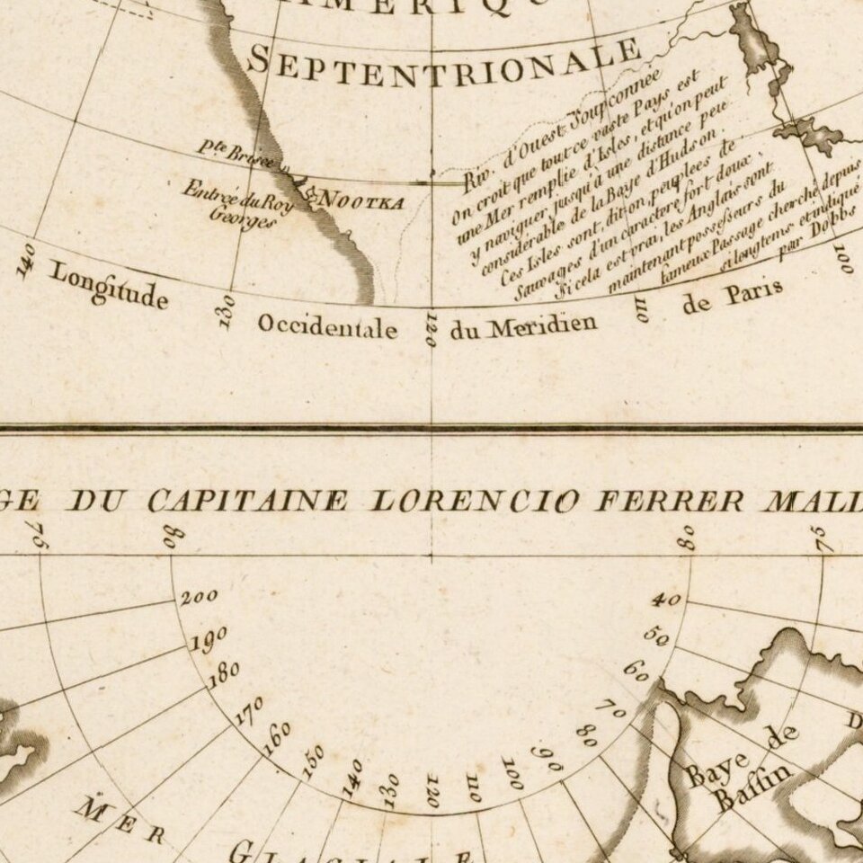 The map focuses on the mythical voyage of the Spanish Captain Lorenzo Ferrer Maldonado. In 1601, Maldonado submitted to King Philip III of Spain a document about his purported 1588 voyage through the Northwest Passage from east to west. His descriptions bear little semblance to reality, though his account received some support from geographers. In 1791 the Spanish government diverted Alejandro Malaspina's expedition to search the entrance reported by Maldonado.