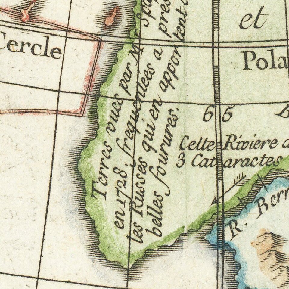 De L'Isle and Buache first worked together on a manuscript map that was presented to the Academy Royale in 1750, and was in good part based on Guillaume De L'Isle's manuscript. This formed the basis of a map that was subsequently published by Buache, the Carte Des Nouvelles Decouvertes Au Nord de la Mer de Sud (Paris, 1752), although it featured some notable amendments.