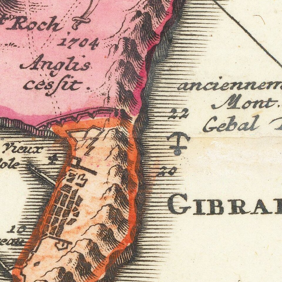 Decorative Johann Baptist Homann engraved map of Strait of Gibraltar, including southern Spain and the northern tip of Morocco, showing Gibraltar, Cadiz, Malaga, Marbella, Algezira, Tetuan, Ceuta, Tangiers, Larache, etc.