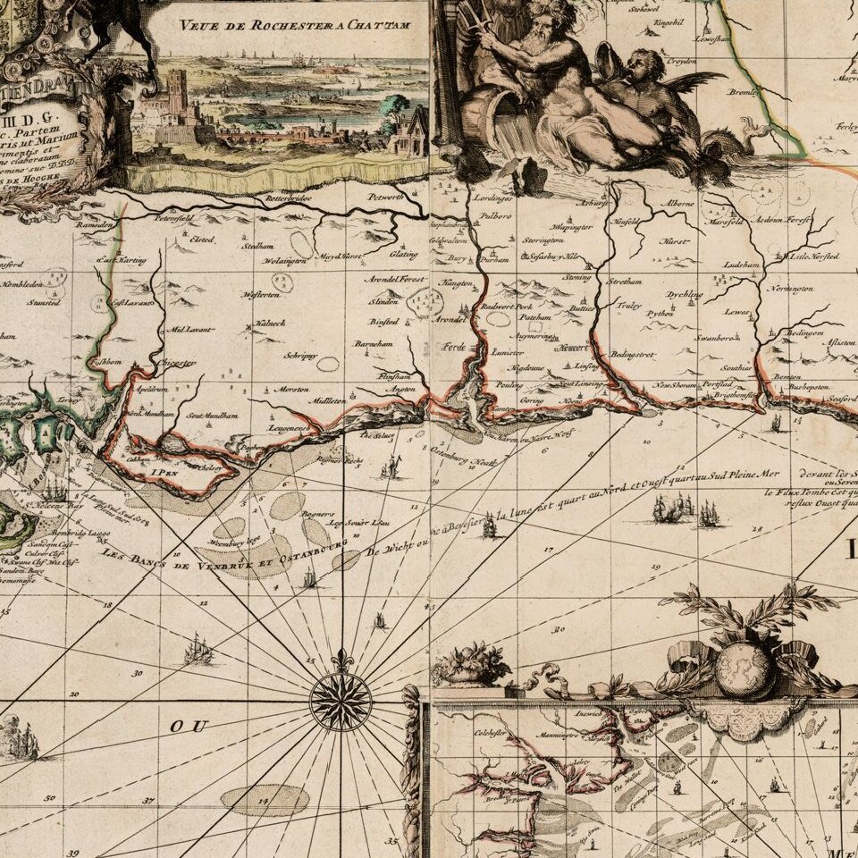 Nice old color example of Romain De Hooghe's regional chart of the southern coast of England, including the Thames and London.