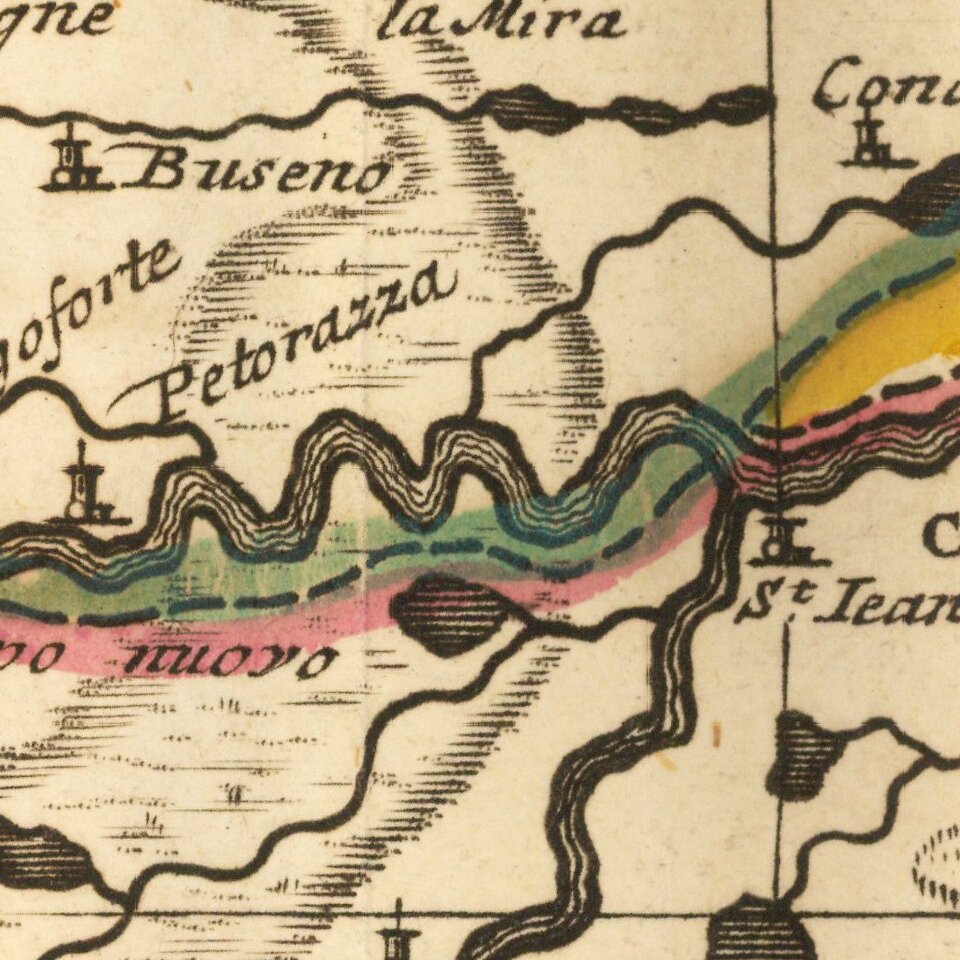 Detailed map of Padua, Italy. Includes the Province of Rovigo and the Gulf of Venice. The map illustrates the islands, roads, pathways, valleys, mountainous regions, forests and waterways the Italian and French armees used to navigate through the region. The map highlights the towns of Padua, Vincenza, and Venice.