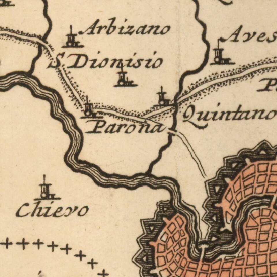 Detailed map centered on Verona, Italy. Published in Amsterdam, circa 1700.