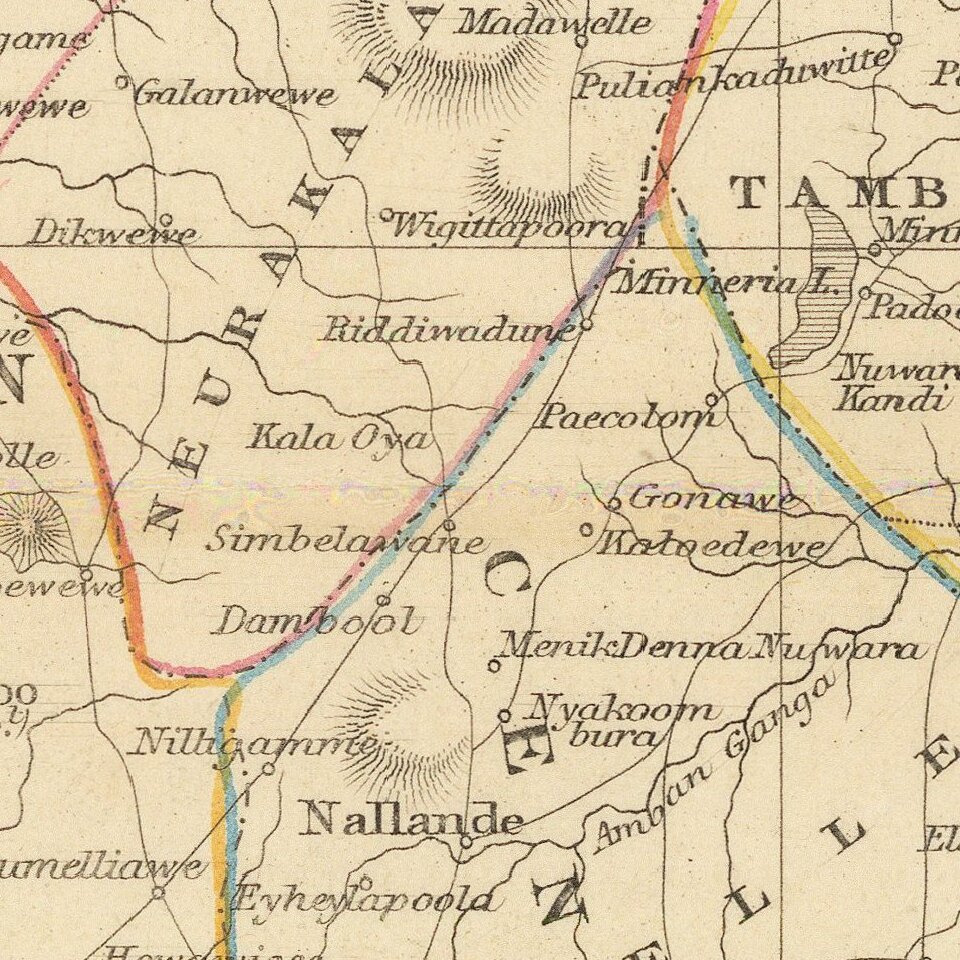 Decorative vignettes of Lake of Kandy, Adams Peak from the Lake of Colorado, Temple of Buddha Kalany and the Ruins of the Dagora at Toopharamaya. Engraved for R. Montgomery Martin's Illustrated Atlas. Tallis was one of the last great decorative map makers. His maps are prized for the wonderful vignettes of indigenous scenes, people, etc.