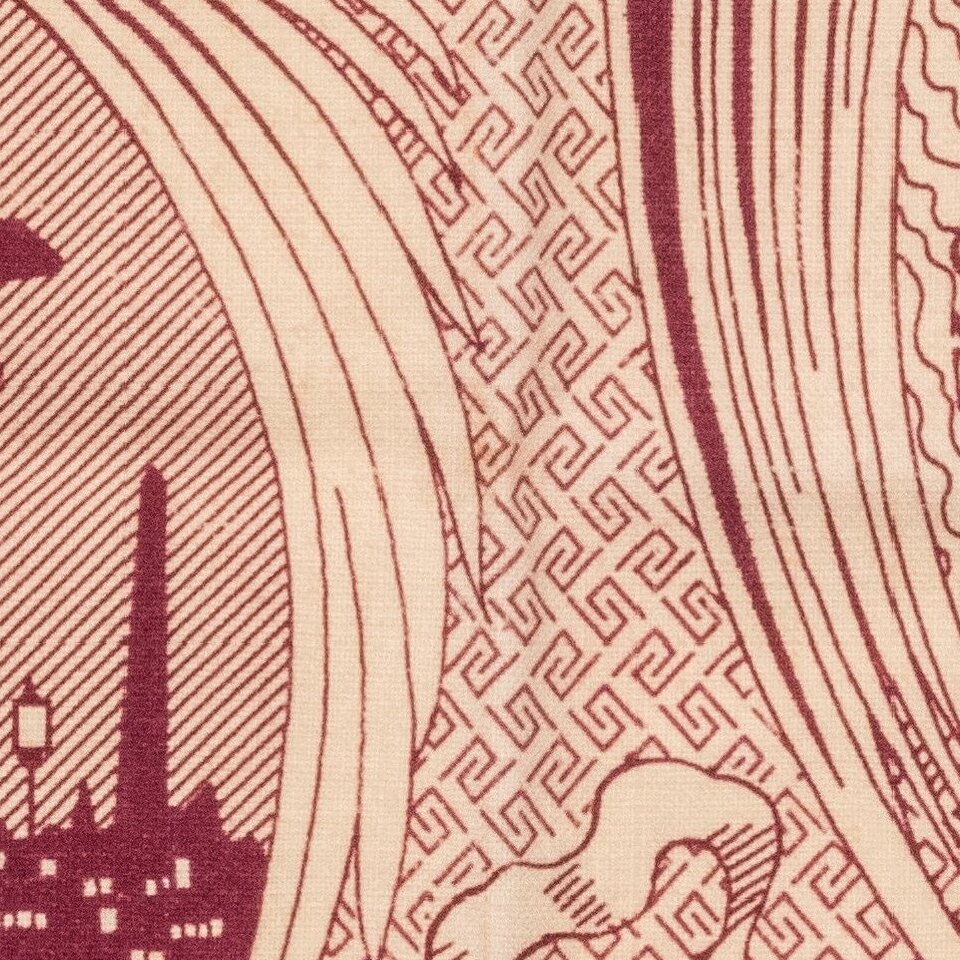 New York to Paris in 33 hr, 29 m is the name of this printed cotton textile depicting the solo flight of Charles Lindbergh from New York to Paris.