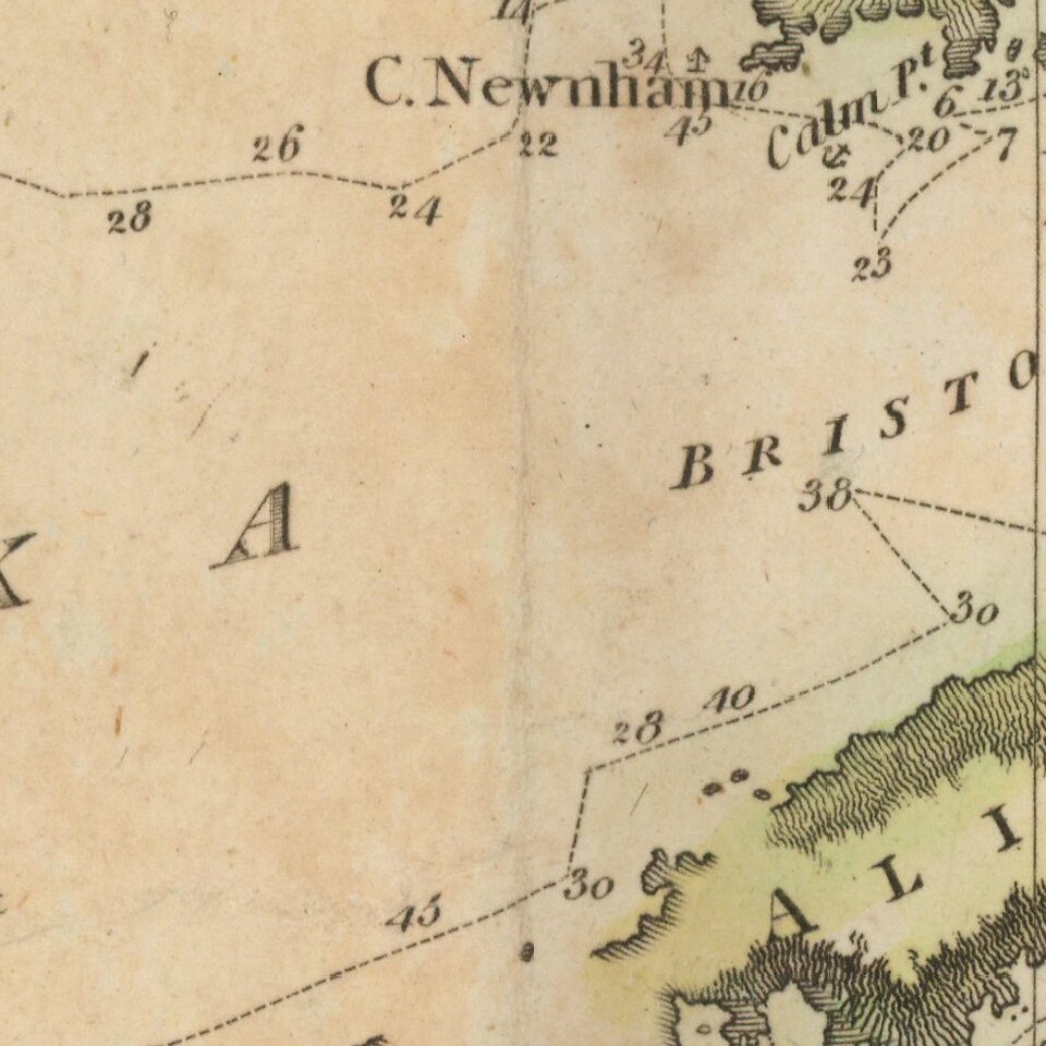 The map extensively tracks the voyages of Captain James Cook beyond the Bering Straits on a nearly daily basis in 1778 and 1779. In the Arctic Sea, a note regarding McKenzie's having cited the Sea on July 10, 1789 is present, along with a note concerning the establishment of a post at Whale Island.
