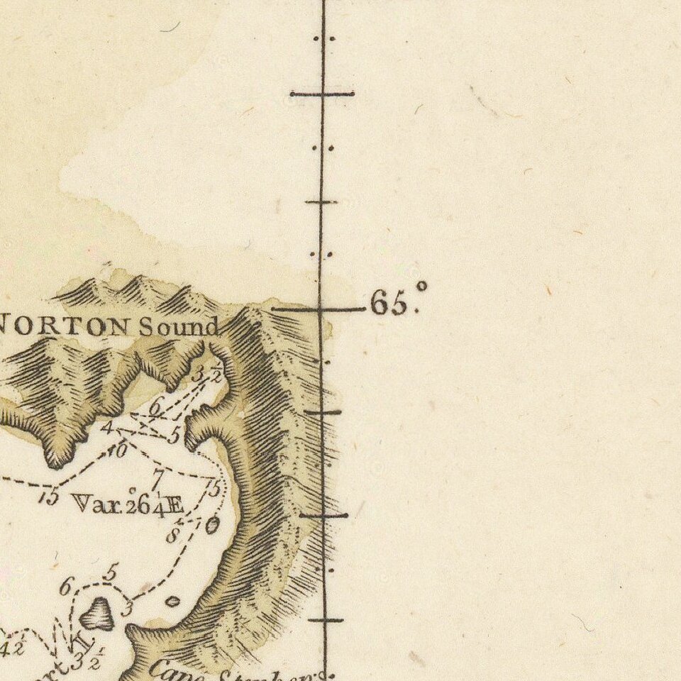 For the first time on a printed map the coastline of Alaska and the northwest coast of North America are accurately portrayed. The map displays Cook and his crew’s great contribution to the mapping of the area, particularly along the coast of what is today Alaska (especially near Prince William Sound), in the Aleutians, and in the Bering Strait.