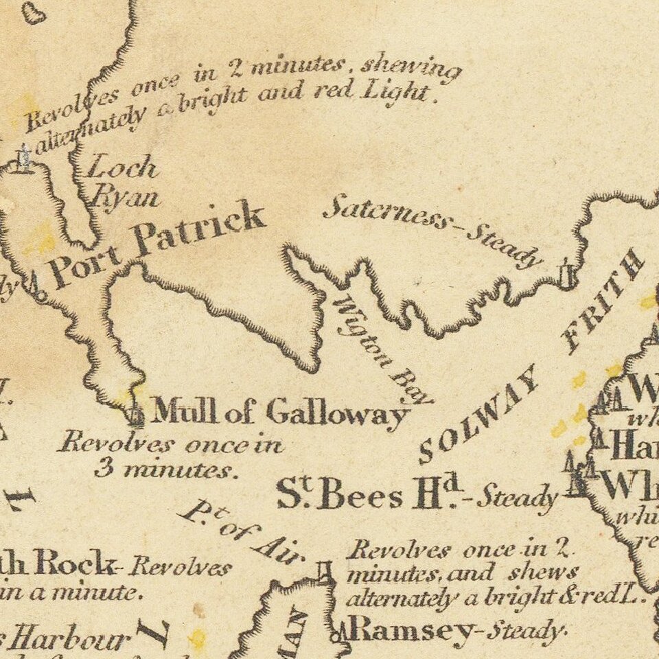The chart is very up to date. For example, the Mull of Galloway light—“Revolves once in 3 minutes”—only opened in 1830, the same year the chart was published. It was built by the Stevensons, uncles of Robert Louis Stevenson, who built many of the lighthouses in Scotland in the first half of the nineteenth century.